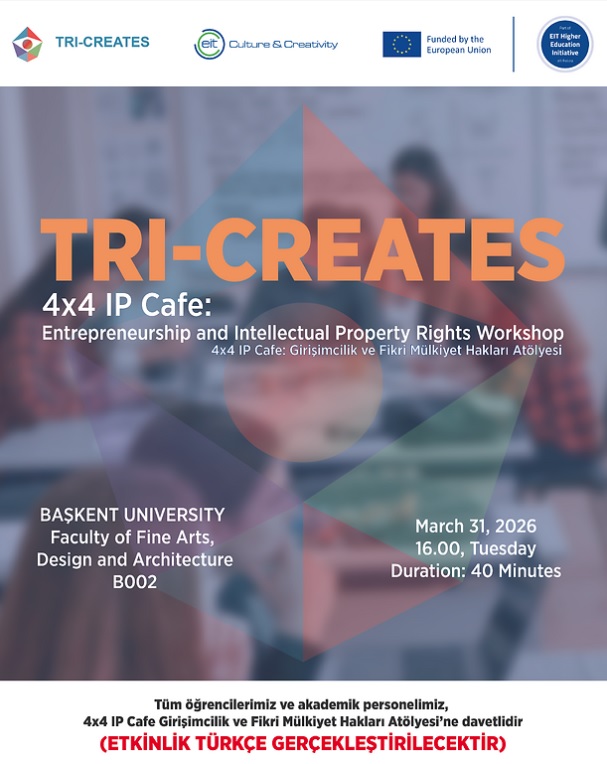 TRI-CREATES projesi kapsamında geliştirilen IP Café modeli, fikri mülkiyet haklarını girişimciler ve yaratıcı ekipler için erişilebilir ve uygulamalı hale getirmeyi amaçlayan yenilikçi bir destek yapısıdır. Bu ilk atölyede, marka (trademark) odağında ödüllü "Re-Source" girişim ekibini ve mentörleri Öğr.Gör. Elif Cemre Çelikcan Yozçu'yu ağırlayacağız. Marka yaratma, koruma ve ticarileştirme adımlarını 40 dakikalık hızlı bir oturumda ele alacağız.